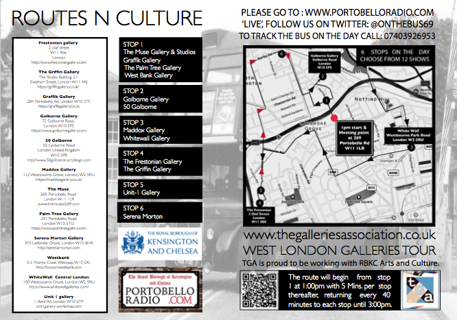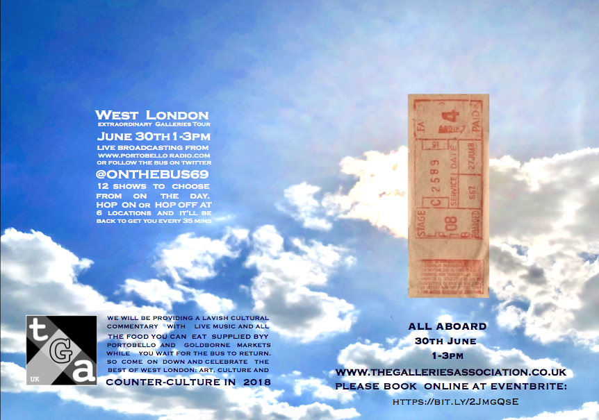 At 1pm on June 30th a Double Decker Bus will start a route from the corner of Oxford Gardens and Portobello Road on a free tour of 9 shows hosted by the small galleries of West London.