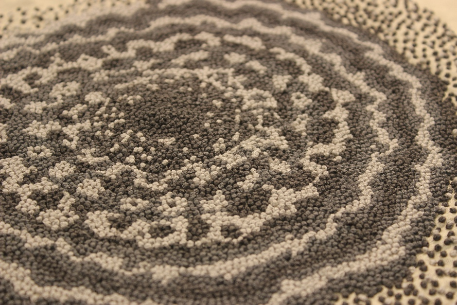 The surface created through these techniques out of simple stitches and lines, moving in transient intensities, sizes and colours suggest natural processes and also reflect the spirit of the creator.'